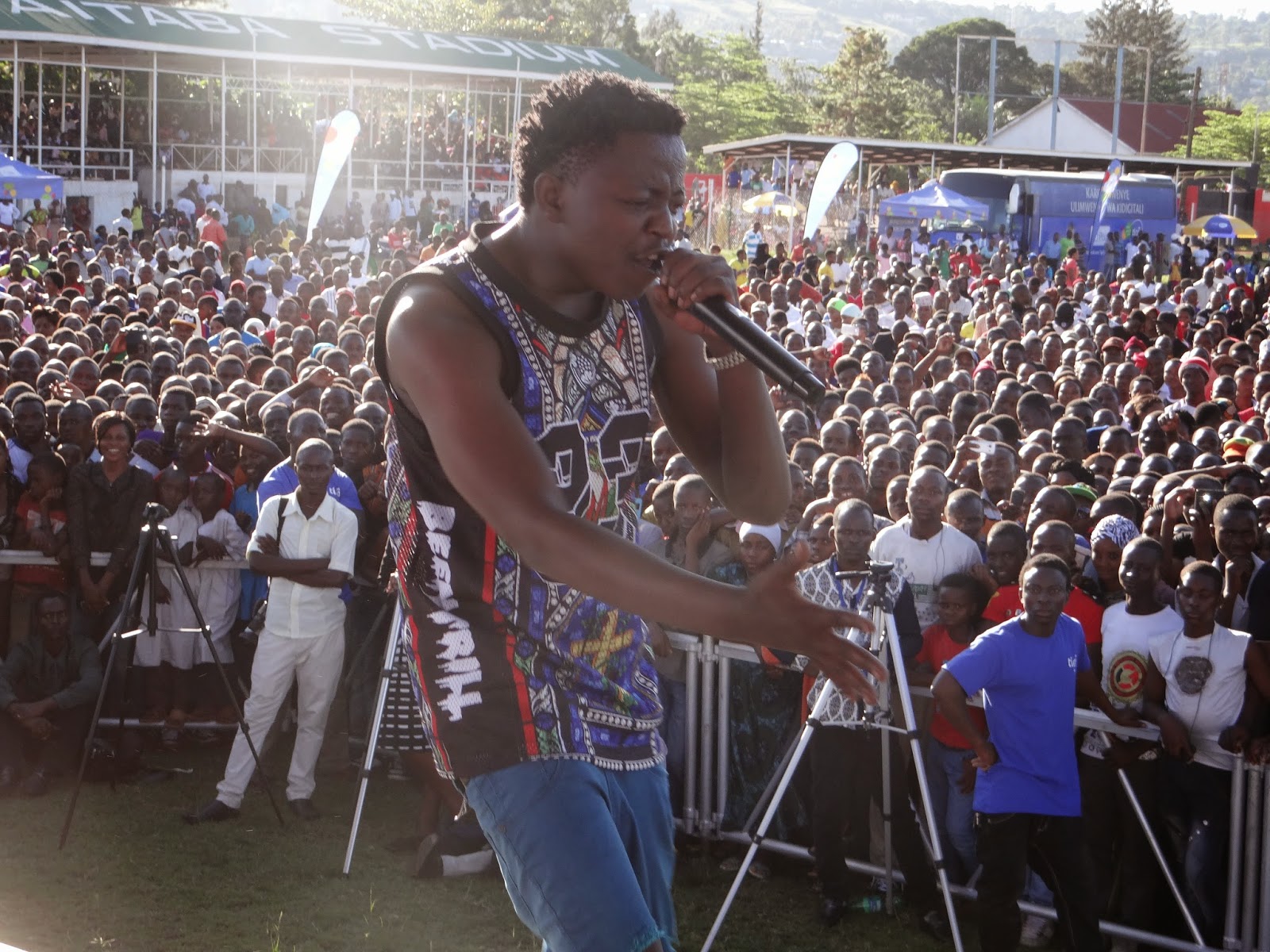 Balozi wa Tigo Joti(wa kwanza kushoto)akiwa amevaa mfano wa sare za jeshi la polisi,alilazimika kuzivua jukwaani baada ya kukutwa akicheza sebene na mavazi hayo ya heshima.Ilikuwa ni moja ya mchezo uliovutia mashabiki rukuki walifurika katika uwanja wa Kaitaba na kufurahishwa na kundi zima la original comedy,Tigo walivunja rekodi kwa watu wengi kujiunga na mtandao wa Tigo katika Manispaa ya Bukoba.