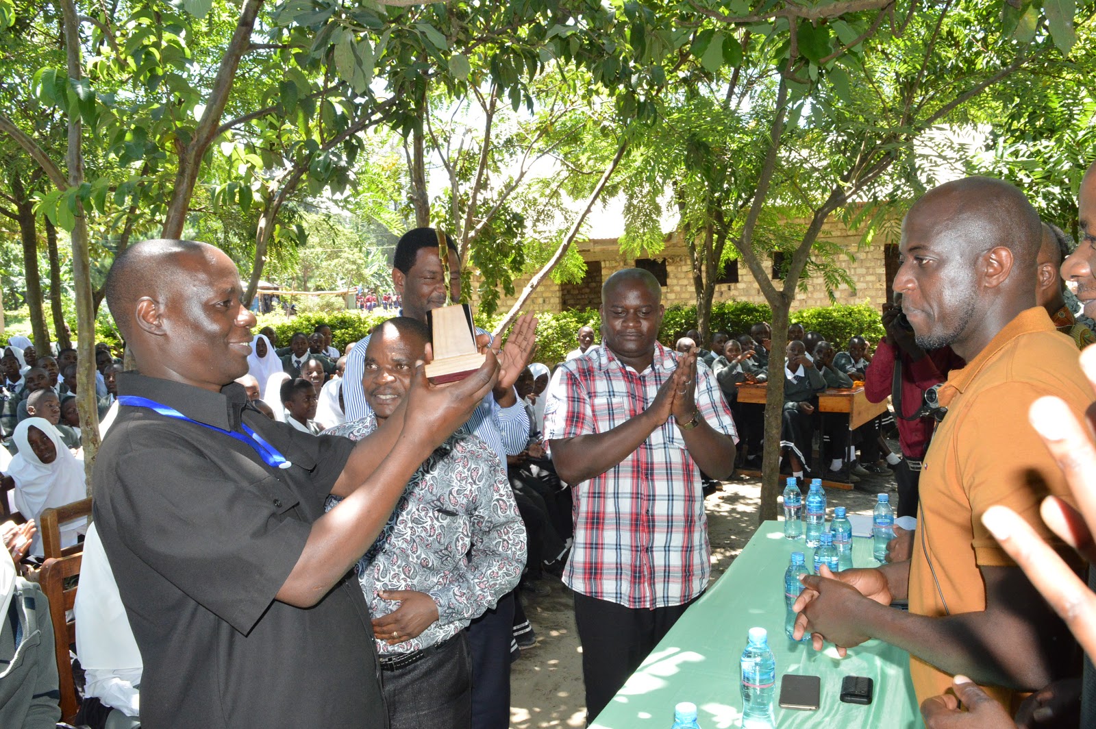 Mkuu wa shule akifurahi Tuzo na wanafunzi.